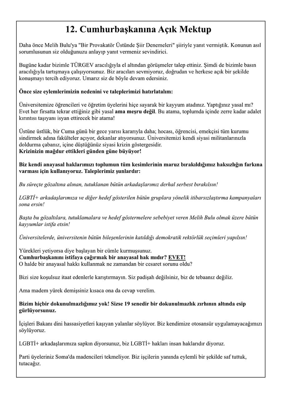 boğaziçi dayanışması hesabından paylaşılan 12. cumhurbaşkanına hitaben kararlı bir üslupla kaleme alınan ülkenin son 19 yıldaki önemli olaylarını da gündeme taşıyarak boğaziçi öğrencilerinin hak mücadelelerini savunan mektup.