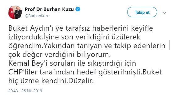burhan kuzu'nun buket aydın hakkında tweet atması