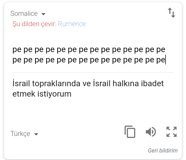 5000 harf sınırını doldurana kadar "pe" yazdım ve çıkan çeviriyi şimdi aşağıya atacağım. Google translate'in yapay zeka kullandığı diller arasında Türkçe de vardı. Artık bu çevirinin sahibi yapay zeka mıdır, bir geliştirici midir yoksa google kendisi mi yapmıştır bilemeyeceğim ama benim çok garibime gitti. Her 'pe' eklememde farklıı farklı çeviriler çıkıyor. Somalice bilen bir yazar bizi aydınlatabilir mi acaba. Bin kere 'pe' desem somalililer beni dövmezler değil mi? Neyse çeviriyi atayım artık: