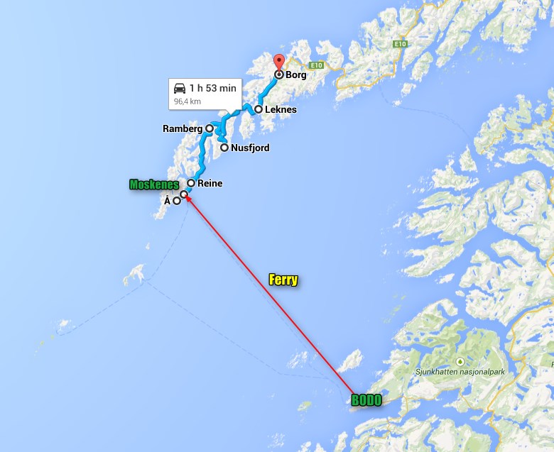 gitmek için bodo' dan moskenes feribotuna binip, a şehrine ve reine şehrine yürüyebilirsiniz arası arabayla 10 dk.