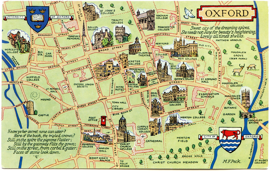 Küçük ama etkili bir ingiltere şehridir. tarih bilinci oldukca korunmuştur. 1700 lü yıllarda çekilen fotograflarla şimdikini neredeyse ayırt edemezsiniz. barındırdığı üniversite ve collegelerden dolayı öğrenci şehridir. ingilizlerden çok yabancı kişiler burada yaşamaktadır. gelelim gezilecek yerlere: öncelikle oxford Science Museum'u görmelisiniz. girişi de ücretsizdir mutlaka gidiniz. Oxford Botanıic Garden masal gibi bir bahçe, ayrı ayrı bölümlere ayrılmış harika bir yer. özellikle eğer öğreciyseniz çok makul bir giriş ücreti var. Christ church yukarı tarafta kalıyor girişi biraz pahalıydı diye hatırlıyorum ama görmeye değer. biliyorsunuz nam-ı değer Hogwarts salonudur kendileri (bkz: harrypotter). Bahçesi de ayrıca güzeldir, mutlaka çimlerde vakit geçiriniz. üniversitenin ana kampüsünün içinde büyük bir park vardır, tipik ingiliz parklarından. yemek için malumunuz ingilizlerin kendilerine has yemekleri parmakla sayılabilecek kadar az olduğundan tüm şehirlerde farklı kültürlerin yemekleri ile karşılaşıyorsunuz. High street de yanyana dizili bol miktarda seçeneğiniz olacaktır. University Church of St Mary the Virgin'de yukarıya kesinlikle çıkıp o mükemmel tarihi Oxford manzarasında fotoğraflar çekilmelisiniz.. Dikkat: tırmanış belli bir yere kadar asansörle sonrası ise dönen merdivenler(cami minaresi gibi dar ve karanlık) Biraz ürkütücü ama buna değecektir.