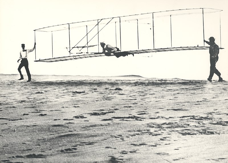 fotoğraf Sayısız testlerden birinde, Wright Planörü'nün üstünde Wilbur Wright, solda Orville Wright, sağda arkadaşları Dan Tate, (10 Ekim 1902).
