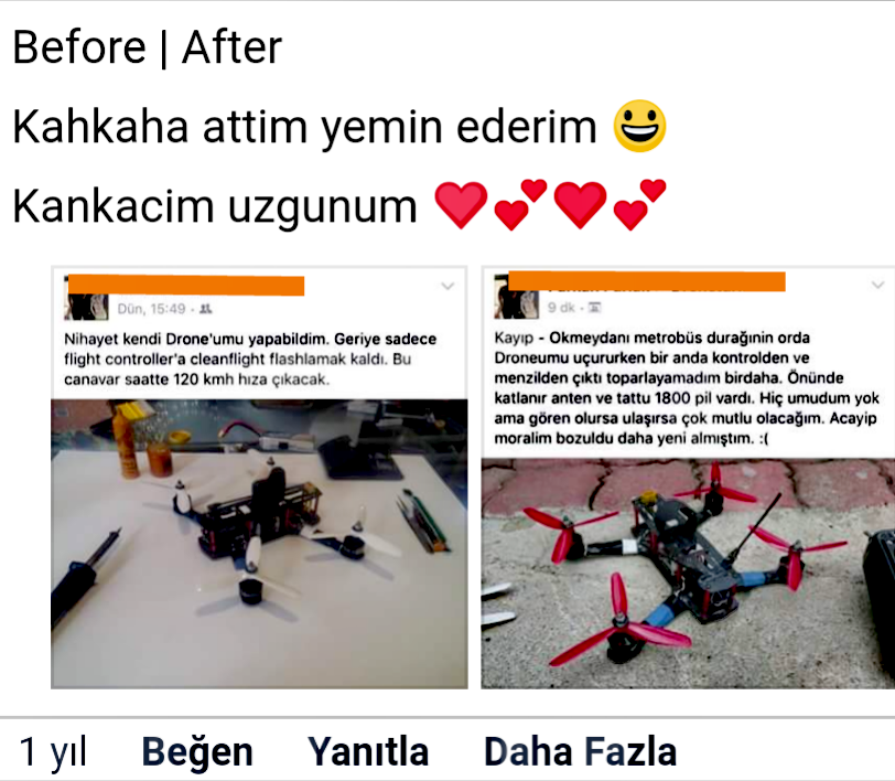 mucit bi arkadaş var grupta. geçen yıllarda iddialı bir drone duyurusu yapıyor, bi saat sonra drone firarda! bulabildi mi bilemiyorum ama vicdansızların diline düşüyor, before-after şov😄